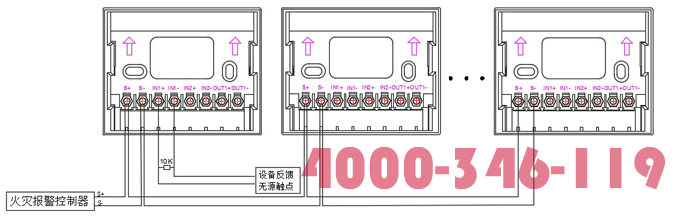 “S+”、”S-”為總線端子,接入火災(zāi)報(bào)警控制器;“IN1+”、“IN1-”接現(xiàn)場(chǎng)設(shè)備無(wú)源觸點(diǎn)的常開(kāi)或常閉開(kāi)關(guān)量信號(hào),同時(shí)在被控設(shè)備的常開(kāi)觸點(diǎn)上直接并接一個(gè)10K終端電阻。