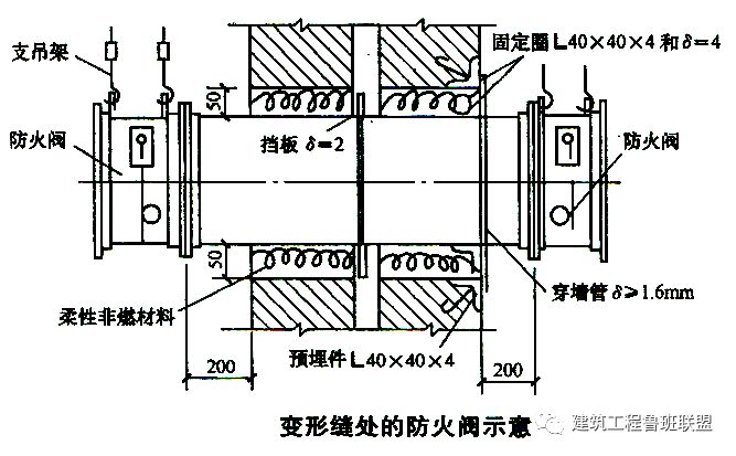 ③:風(fēng)管穿越結(jié)構(gòu)變形縫處應(yīng)設(shè)置三防帆布柔性短管(消防風(fēng)管采用防火帆布),其長度每邊長出變形縫寬度100mm。負(fù)壓風(fēng)管要采用金屬軟接。